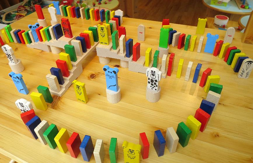 動物が描かれたカラフルなドミノと木製ブロックなどがセットになったアニマルドミノレース。