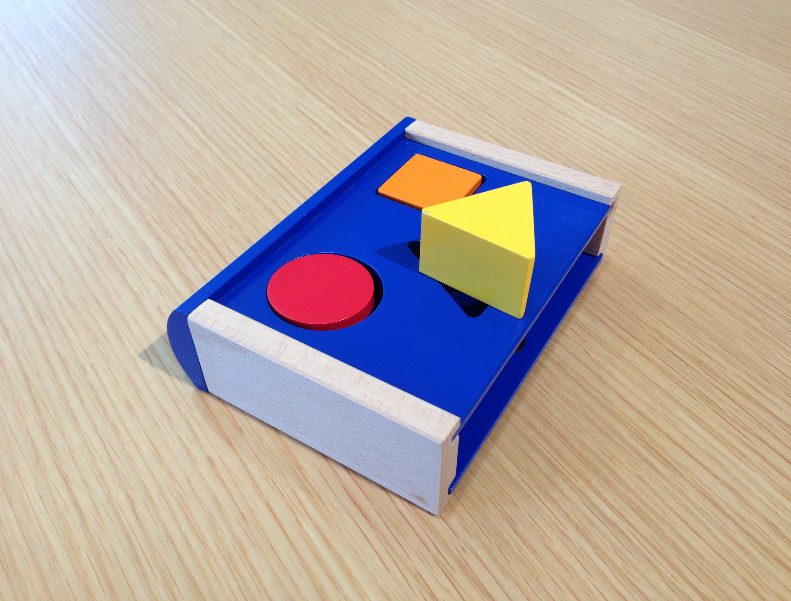 BRIOの知育玩具に新シリーズ、ブックタイプが登場! 丸・三角・四角の積木を、本体の穴にうまくはめよう。 全部はまったら裏の板をスライドすると、積木が取り出せるようになっています。